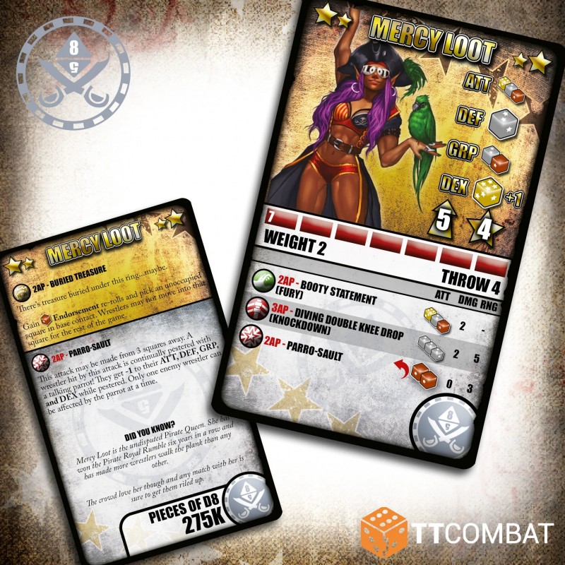 This pirate wrestler is as formidable in the ring as she is on the rough seas. Mercy brings a wide range of moves to the table, enabling her to adapt to any situation. With the Booty Statement hold, she grabs her opponent and follows up with Fury to crush her under a shower of Brawl attacks.