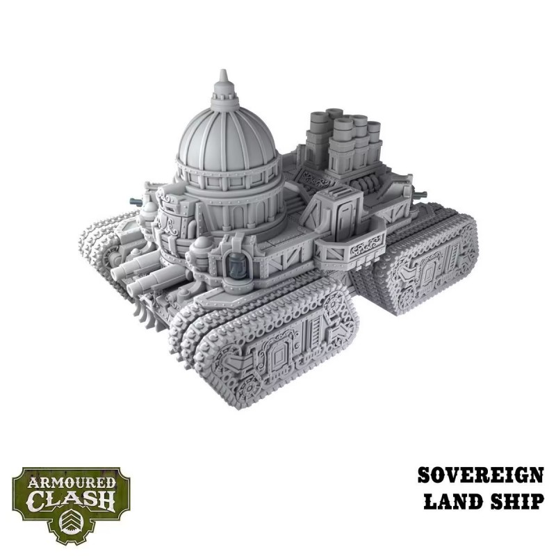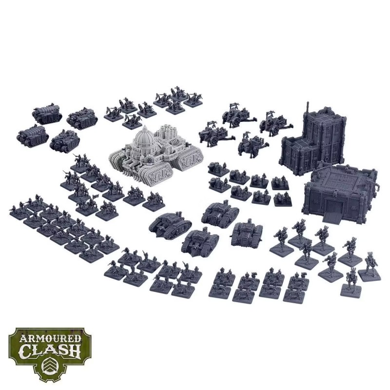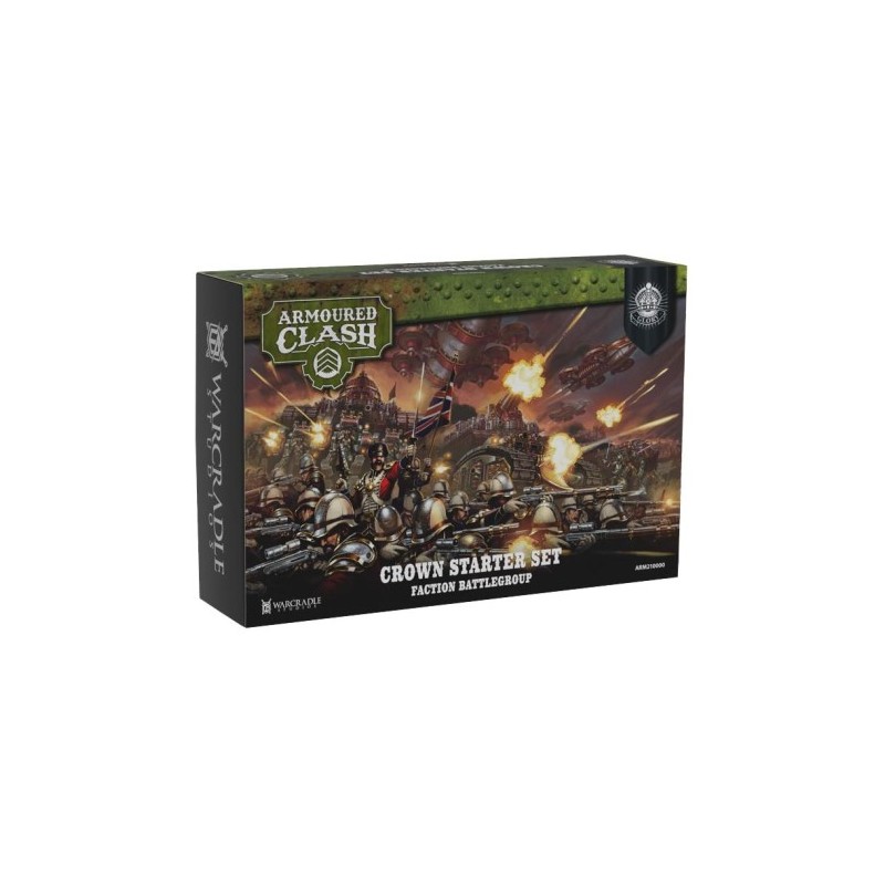 This starter pack contains everything you need to start playing *Armoured Clash*, taking command of the mighty Crown Dominions. Under the banner of Queen Victoria, Her Majesty's infantry platoons execute merciless salvos, while the cavalry of the Horse Guards charge with swords in hand. The robust Galahad tanks advanced relentlessly, supported by the terrible explosions of the Mordred heavy artillery. Dominating the battlefield, the sovereign land ship crushes everything in its path, be it vehicles, fortifications or infantry.