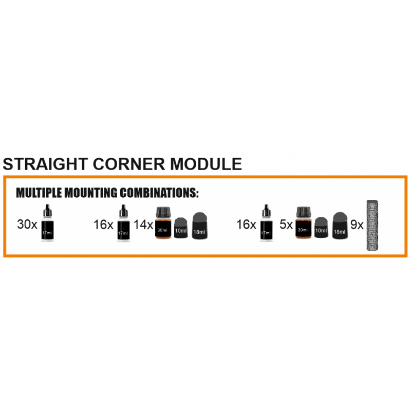 Paint bottle display made of high-quality MDF. Assembly is quick and easy. For optimum reinforcement, we recommend using standard white glue. This set includes connecting pieces for attaching it to other modules on the sides, and is also compatible with GSW drawer modules.