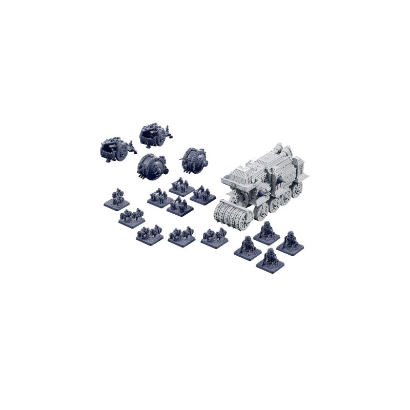 In this Armoured Clash Battlegroup Set, you’ll find a Behemoth, along with tanks and other units worthy of the Empire. The Behemoth gives you two options to choose from to bolster your force. More aggressive players may prefer the Laoshan Landship. This massive roller, built into the front of the mighty machine, is capable of crushing steel and flesh under its massive spikes, while allowing the cannons adorning it to continue firing. The other option is the Wutai Landship, which is better suited to ranged engagements. Its massive cannons can ravage enemies from afar, but if an opponent manages to get close, its many flame weapons will unleash alchemical fire.