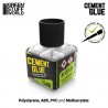 This type of glue, suitable for working with plastics, comes in liquid form and is applied directly to the surfaces to be joined. When used, it slightly melts the parts, creating a sort of chemical "weld" that fuses the elements and provides a uniform and robust finish, similar to metal welding. This glue is particularly suitable for materials such as polystyrene, ABS, plastic card, and HIPS, frequently used in modeling and for models.