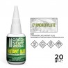 This glue is a single-component adhesive based on synthetic acrylic resins called cyanoacrylates. When in contact with a surface, it reacts with the humidity in the air, forming a strong bond in a matter of seconds. It is packaged in a practical bottle with a nozzle applicator for precise distribution.
