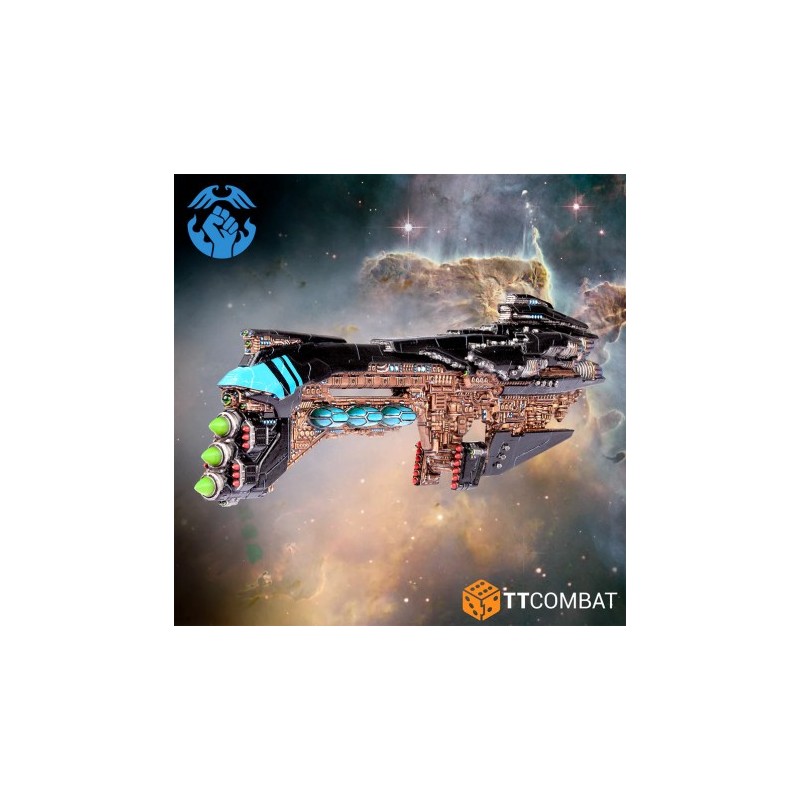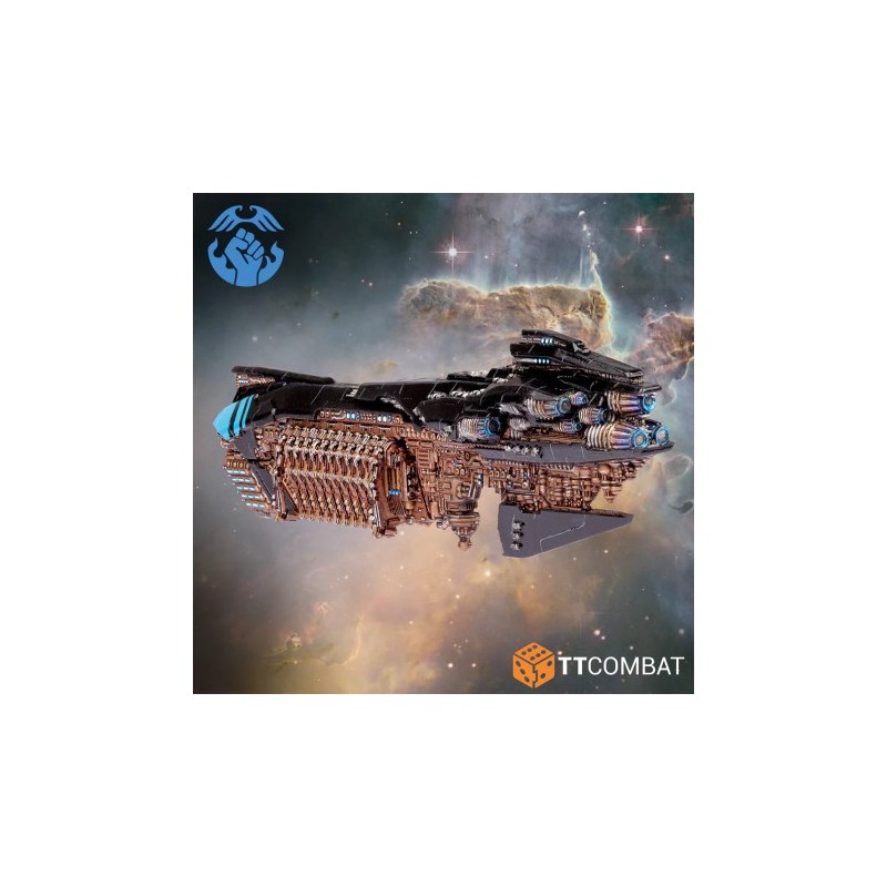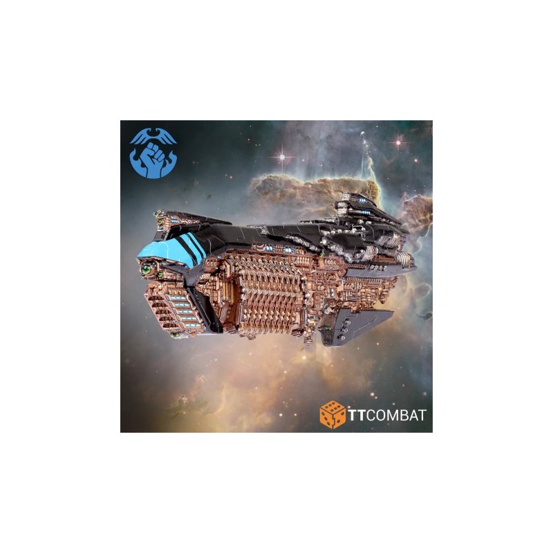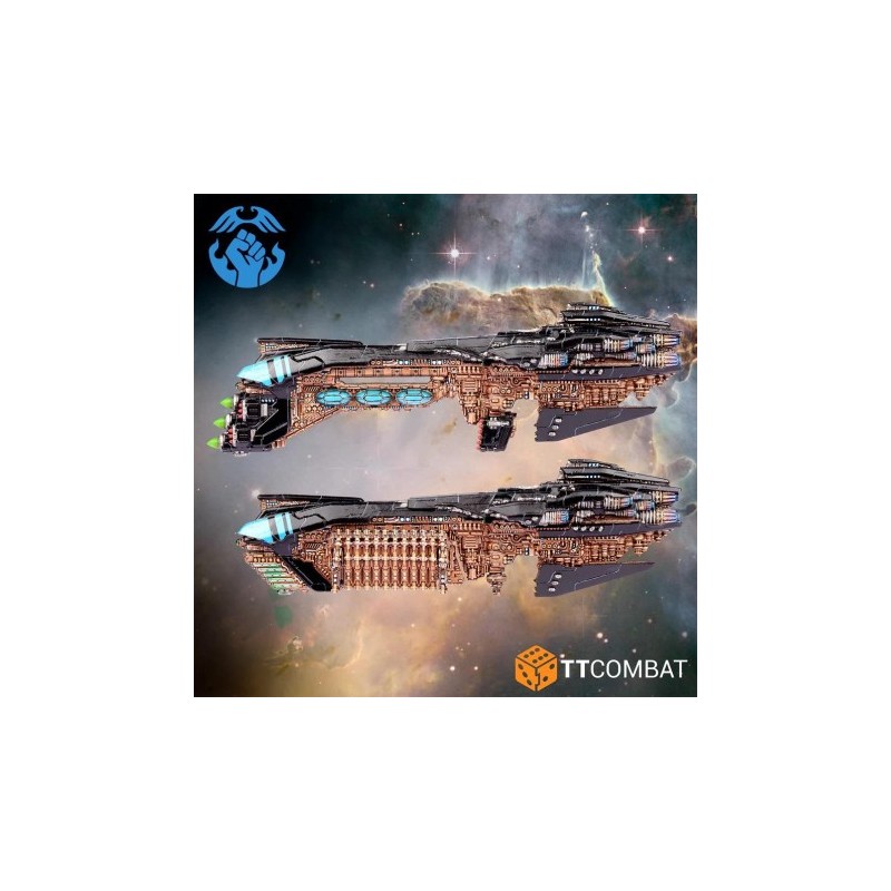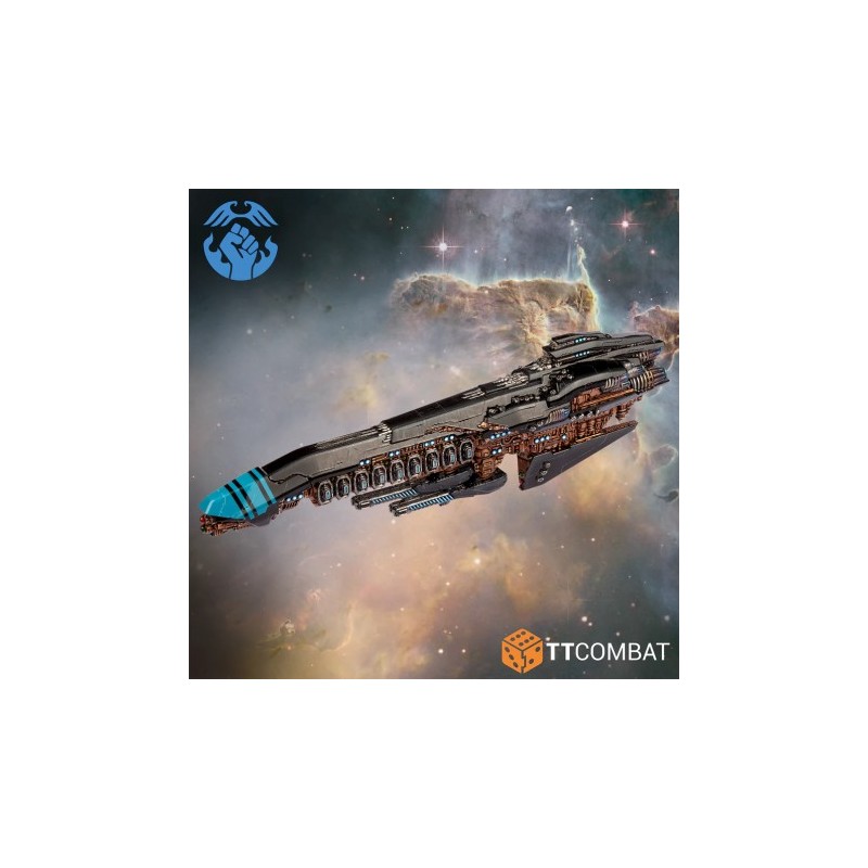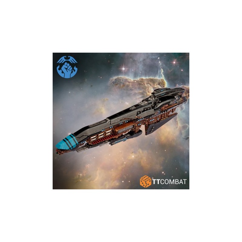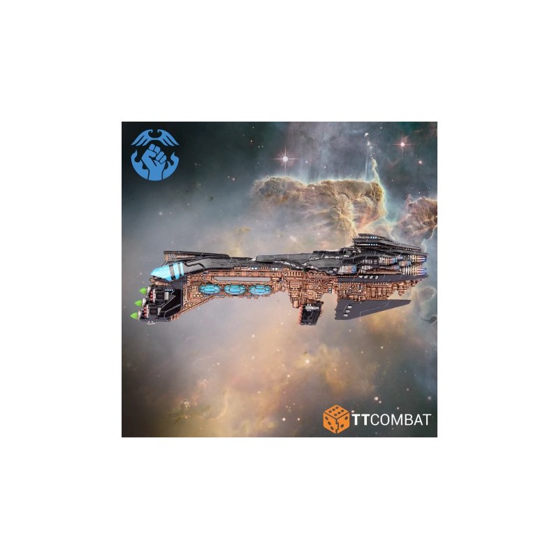 The Tribune combines a pair of conventional artillery gun turrets with increased firepower for close-quarters combat, plus a single mass driver turret. Unusually for a ship of its size, it also has massive landing capabilities and a flight deck, making it an aircraft carrier. This makes it a versatile ship, capable of adapting to the most varied combat situations with great efficiency.