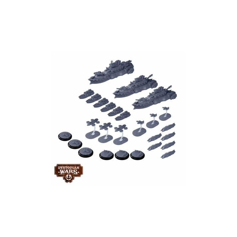 This battle fleet set for Dystopian Wars contains everything you need to assemble a Senator long-range command cruiser and its battle fleet. As the Union of Federated States seeks to extend its global influence through a new ‘Manifest Destiny’, a fleet of long-range ships has been designed. This enables them to expand their borders, encroach on the colonies of the great powers and conquer unexplored lands. The long-range landing ship Midway gives ground troops the ability to capture almost any target, while the long-range cruiser Philadelphia provides modern striking power to wipe out enemy patrol fleets. In support, the support ship Nashville provides resources for prolonged engagements, and the Puritan submarine automatons offer a strike force hidden beneath the waters.