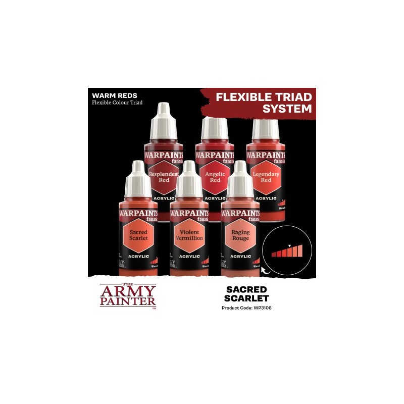 Warpaints Fanatic: Sacred Scarlet is a light reddish orange, versatile as a base coat or mid-tone. It is one of the two mid-tones in the ‘Warm Reds’ triad of flexible colours, and its practical name is ‘Light Reddish Orange’.