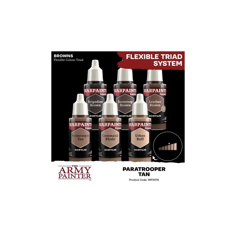 Warpaints Fanatic: Paratrooper Tan is a light brown that can be used on its own as a base or lightening tint. It is one of the two intermediate shades in the ‘Browns’ triad of flexible colours. Its practical name is ‘Light Brown’.