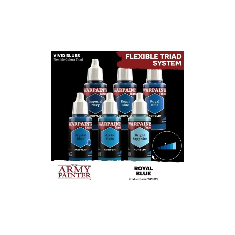 Warpaints Fanatic: Royal Blue is an intense blue, versatile as a base coat or highlight colour for vivid blues. It is one of two intermediate shades in the ‘Vivid Blues’ Flexible Colour triad, and its practical name is ‘Bleu Intense’.