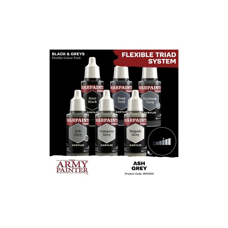 Warpaints Fanatic: Ash Grey is a neutral grey paint that matches the Colour Primer of the same name. It is one of two intermediate shades in the ‘Black & Greys’ Flexible Colour triad, and its practical name is ‘Grey’.