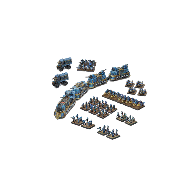 This armoured battle group includes an imposing Lakota heavy train, a major asset for the Union forces. Unique among the war machines of the great powers, the Lakota and its weaponry pose a strategic dilemma for their opponents: should they first neutralise the engine and mobility of the carriages, or attack the carriages directly to reduce the firepower of the behemoth? Each of the Lakota's guns has a distinct speciality, such as the infantry transport at the Newhaven advanced garrison or the indirect fire rockets at the Houston firing base. In some smaller battles, a general can even deploy a super-heavy Lakota alone, a capability beyond the reach of other factions.