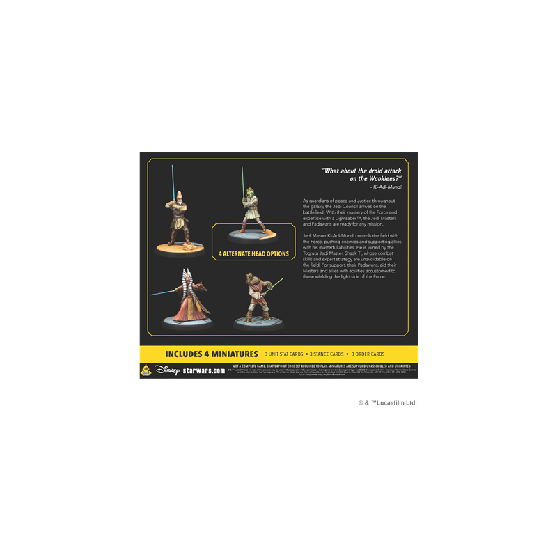 As guardians of peace and justice across the galaxy, the Jedi Council takes to the battlefield! With their mastery of the Force and expertise with the lightsabre, the Jedi Masters and Padawans are ready to take on any mission. Jedi Master Ki-Adi-Mundi dominates the terrain with the Force, repelling his enemies and supporting his allies with his exceptional skills. Alongside him, the Togruta Jedi Master Shaak Ti stands out for her combat skills and infallible strategy. To support them, their Padawans provide assistance to their Masters and allies, using powers characteristic of those who wield the Light Side of the Force.