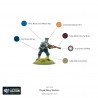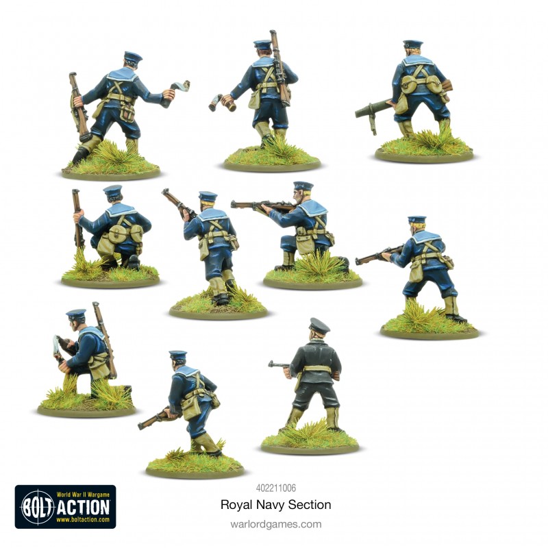 This set includes 10 finely detailed metal miniatures portraying Royal Navy sailors in dark blue uniforms and 1908 pattern webbing. Included are one petty officer with submachine gun, a two-man Lewis gun team, and seven sailors with rifles—three of them armed with Molotov cocktails. The box also contains plastic bases and one Bolt Action order dice. Models are supplied unpainted and require assembly.