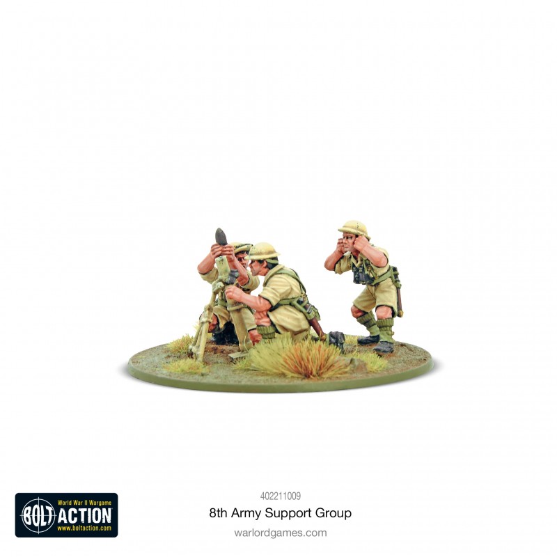 Bring firepower and command structure to your British 8th Army forces with this versatile support pack for Bolt Action. This set includes a Headquarters team, a Medium Machine Gun team, and a Medium Mortar team – all essential units to reinforce your infantry platoons in the harsh environments of the North African campaign. Each component adds tactical depth and historical authenticity to your army.