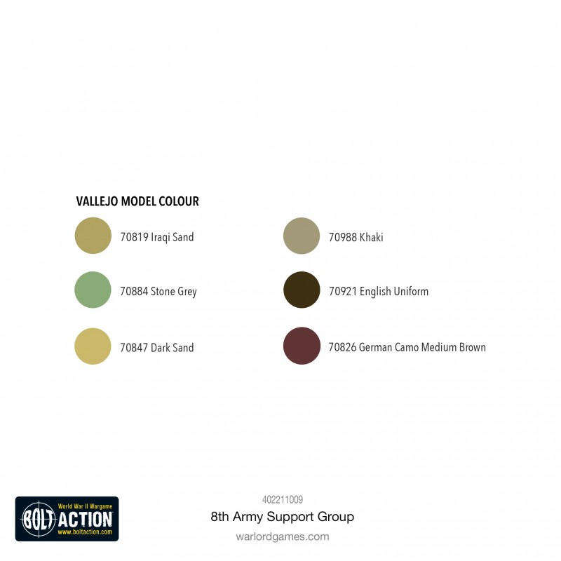 The 8th Army HQ features a commanding officer, typically from Britain’s upper-middle class, accompanied by up to two attendants. Educated in the traditions of empire and trained in leadership, these officers bring confidence and discipline to your forces. On the battlefield, they play a crucial role in issuing orders and coordinating actions. Supporting fire comes from the .303 Vickers medium machine gun team – a water-cooled weapon of WWI origin that proved effective throughout WWII thanks to its ability to deliver sustained fire over long distances.