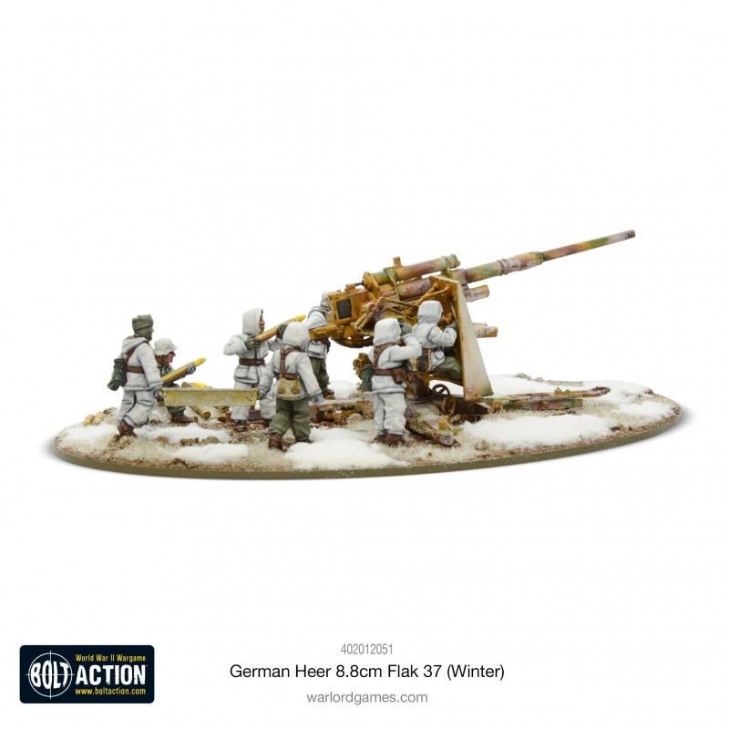 In Bolt Action games, the 88 can be included in Artillery Platoons as a Superheavy anti-tank gun mounted on a rotating platform, with the option to fire as a Medium howitzer, making it the most versatile artillery piece in the game. It can be towed by the Sd.Kfz 7 half-track. Contents include one hard plastic 8.8cm Flak 37 dual-purpose AA/AT gun with full elevation and rotation, seven metal German Heer crew in winter uniforms, a full-colour waterslide decal sheet, and a construction leaflet. Models are supplied unassembled and unpainted.