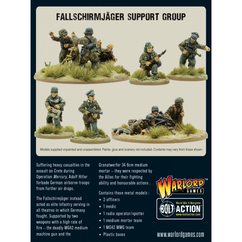 After suffering heavy casualties in the airborne assault on Crete, the Fallschirmjager instead acted as elite infantry serving in all theatres in which Germany fought. This Support Group boxed set contains a selection of ubiquitous Headquarters Units and Weapons Teams to supplement your Bolt Action Army.