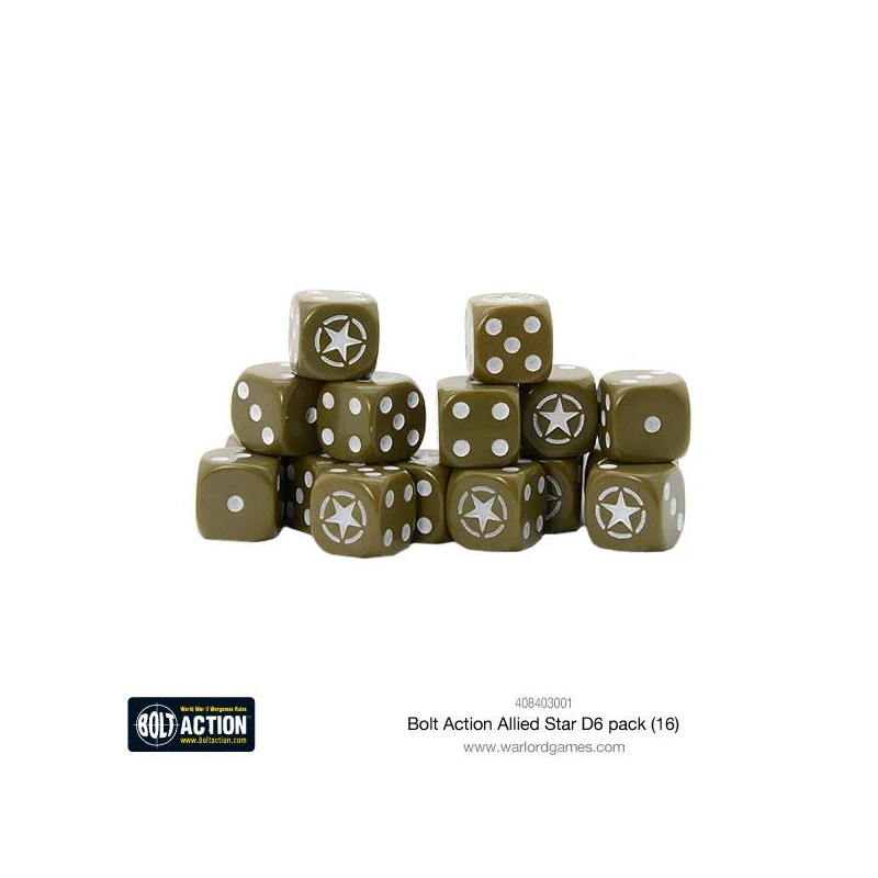 Enhance your Bolt Action games with this stylish and thematic dice set designed for Allied forces. This pack includes 16 olive drab D6 dice with crisp white inscriptions, perfectly evoking the look of WWII military equipment. Replacing the number six on each die is the iconic white Allied star, the unmistakable symbol of American, British, and other Allied forces during the conflict.