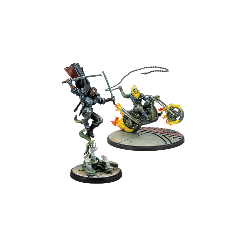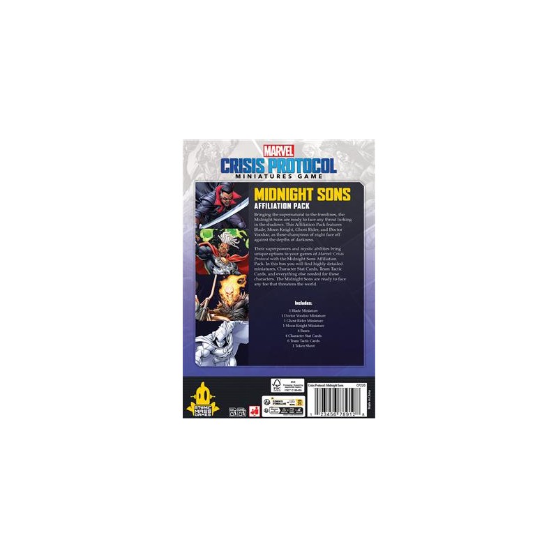 The "Midnight Sons" affiliate pack brings together the champions of darkness from the Marvel Universe to take on the darkest of threats. Blade, Moon Knight, Ghost Rider and Doctor Voodoo join forces in this re-released affiliate pack.