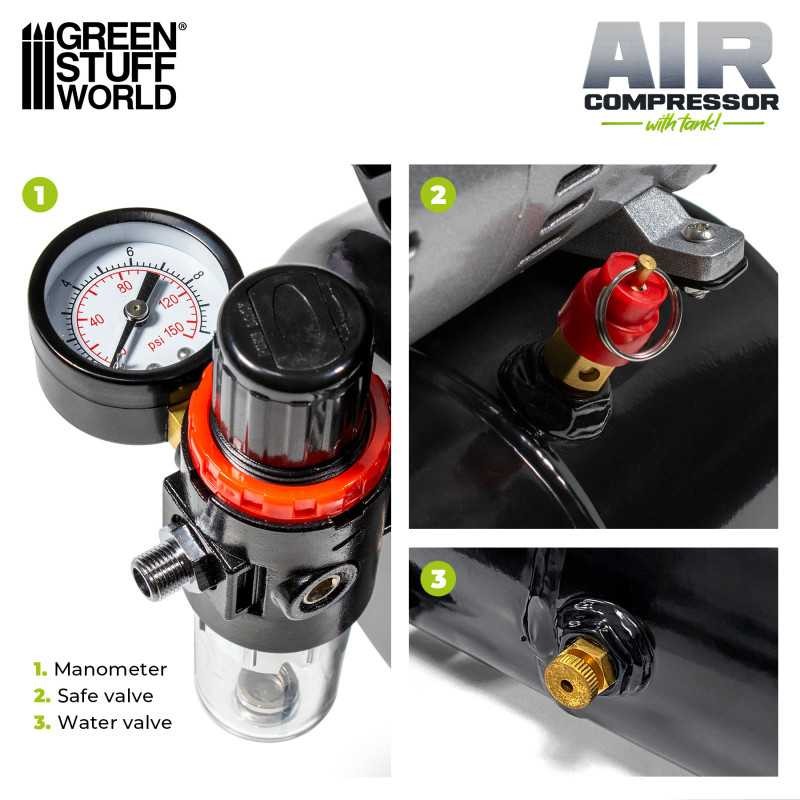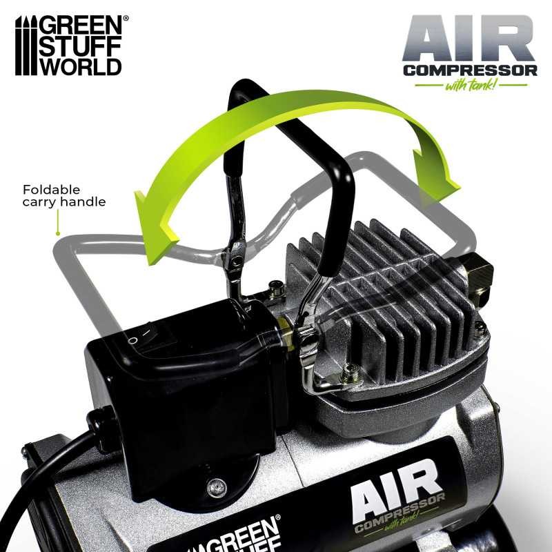 This compact airbrush compressor from Green Stuff World is specially designed to provide a stable, quiet flow of compressed air, ideal for model making and other artistic applications. Its oil-free, single-cylinder motor ensures efficient performance, while its 3-litre tank guarantees a constant air flow of 20 to 23 litres per minute, compatible with nozzles ranging from 0.16 mm to 1.5 mm.