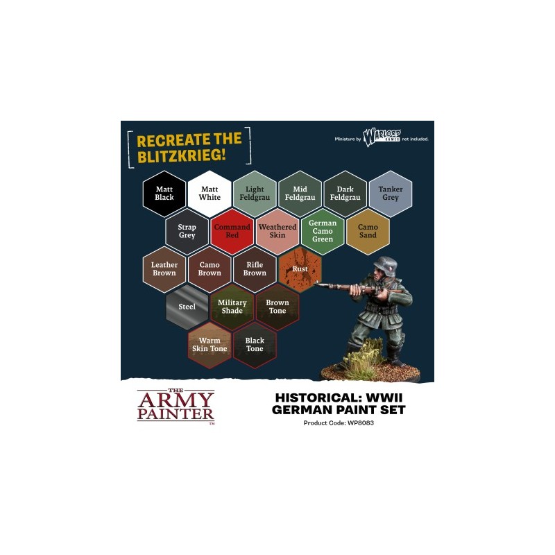 From feldgrau tunics to the intricate camouflage patterns of late-war infantry, this set provides you with the full palette of tones needed to accurately represent German forces throughout the Second World War. Designed in collaboration with historians, these paintings capture the subtle shades of grey-green and country brown that marked this period.
