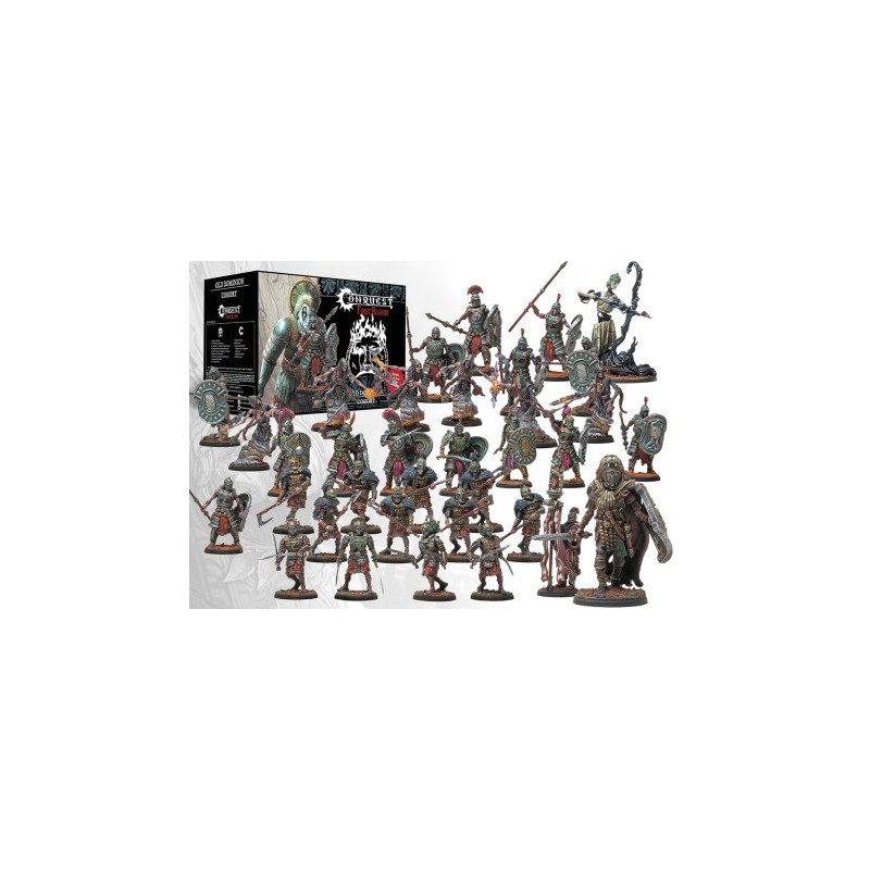 Inside the box, you'll find 36 finely detailed miniatures: a commanding Strategos, a haunting Profane Reliquary, 9 Legionnaires, 6 Praetorian Guards, 8 fierce Varangian Guards, 4 elite Athanatoi, a powerful Karyatid, and 6 Kheres. These units showcase the army’s strength—sturdy infantry supported by supernatural constructs and ancient warriors. The set includes all required components to start playing: bases, command cards, assembly instructions, a quick start guide, and a welcome booklet to ease your introduction to the game.