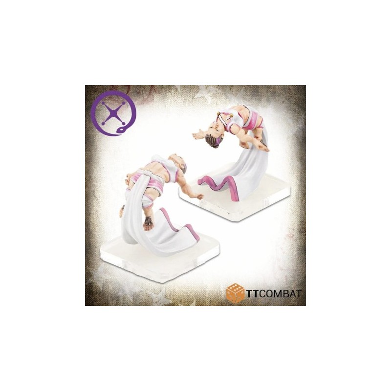 The Halfling Pinner is a solid wrestler not to be underestimated. Her Ground Game Expert ability grants a silver dice on Grapple checks, making her deadly on the mat. Meanwhile, the Halfling Acrobat soars around the ring with incredible precision, bouncing from rope to rope and outmaneuvering much larger opponents.