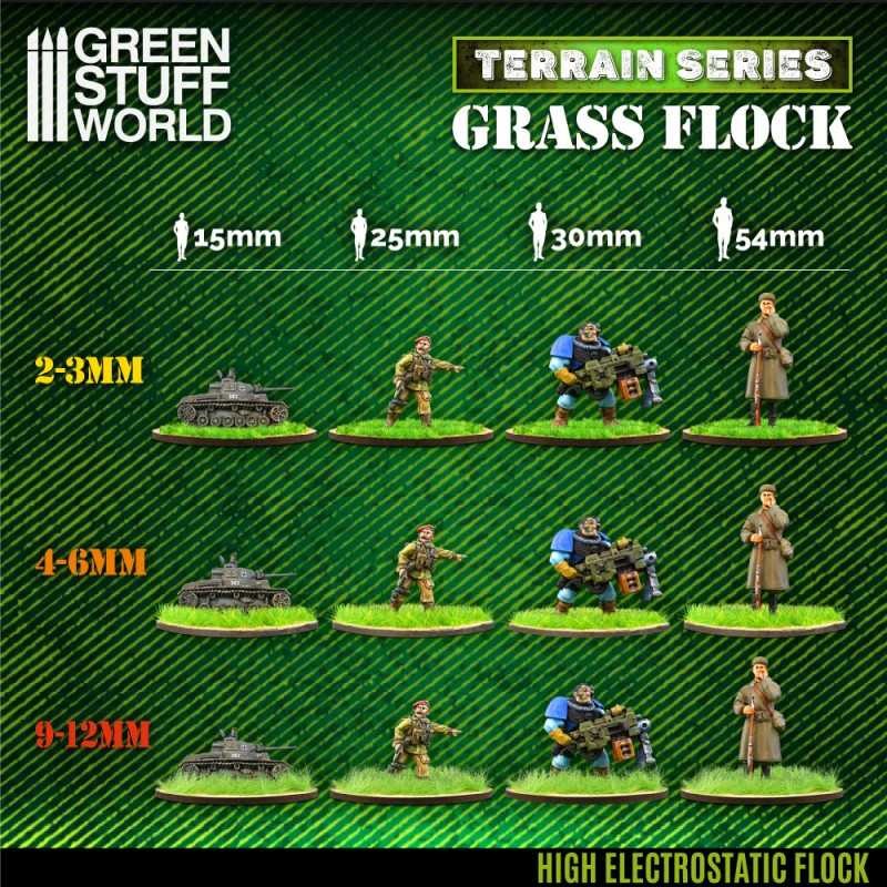 Green Stuff World’s electrostatic grass is a high-quality and realistic material designed for decorating miniature bases, scenic terrains, and dioramas. When applied with a static grass applicator, the fibers stand upright, perfectly mimicking natural grass. Its fine texture and lifelike appearance make it an excellent choice for hobbyists and wargamers seeking a professional finish.