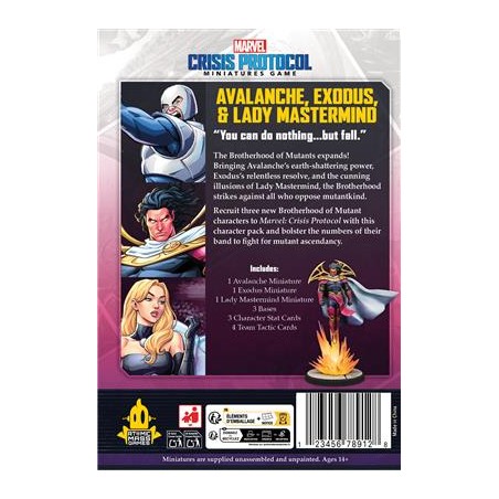 The Brotherhood of Mutants grows stronger in Marvel: Crisis Protocol with the arrival of three formidable new members. Avalanche, Exodus, and Lady Mastermind bring seismic power, unshakable conviction, and mental manipulation to the battlefield, reinforcing the mutant cause against all who oppose them. This character pack offers new strategic depth and powerful abilities to help assert mutant superiority in your games.