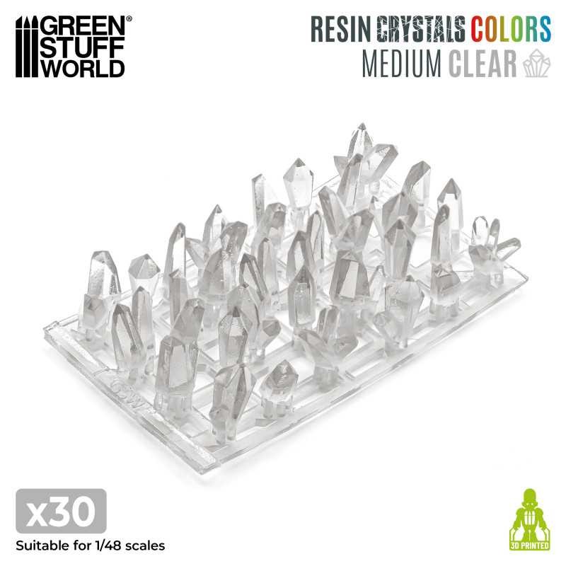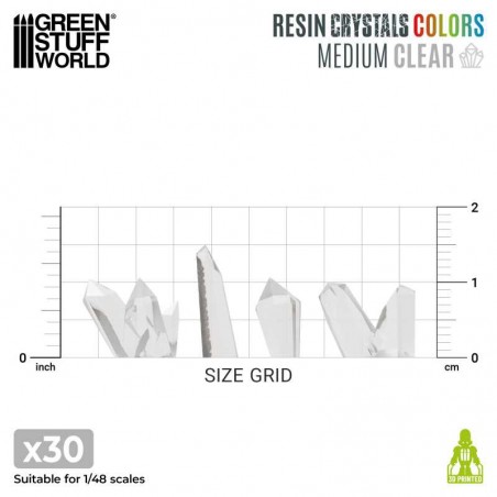 Enhance your miniatures, dioramas, and scenic bases with this set of 30 transparent resin crystals. Crafted from high-quality 3D resin, these crystals offer durable structure and fine detailing, making them an excellent choice for adding realistic features to your modeling projects. Each crystal is coated with an epoxy varnish, ensuring long-lasting shine and protection against scratches, impacts, and everyday wear.