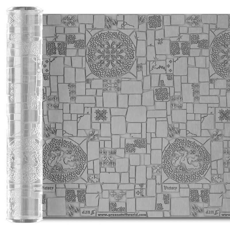 This textured roller made of transparent PMMA is a modeling tool designed to imprint detailed patterns onto a variety of materials such as putties, clays, and modeling pastes. Manufactured from non-toxic, non-stick acrylic, it ensures clean and snag-free application even on sticky materials. Measuring 14.5 cm in length and 2.5 cm in diameter, it provides excellent grip and control. This specific model features a rich combination of textures, including multiple brick types, fleur-de-lys elements, ornamental shapes, and fine filigree—ideal for scenic bases, fantasy settings, or historical scenery in miniature builds.