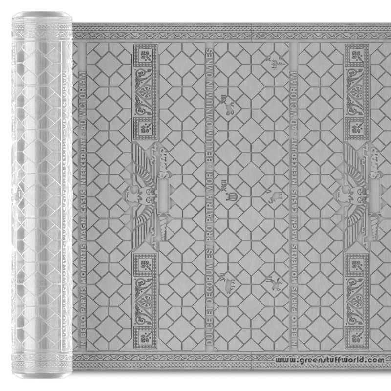 This textured roller is a modeling accessory designed to effortlessly add depth and relief to your creations. Made from clear, non-toxic PMMA plastic with a non-stick finish, it ensures clean handling and precise application. Measuring 14.5 cm in length and 2.5 cm in diameter, the roller features a fully engraved Roman-style pattern, including ancient letters and decorative symbols. It’s the perfect tool for artists, miniature painters, and modelers looking to enhance bases or scenic elements with historical flair.