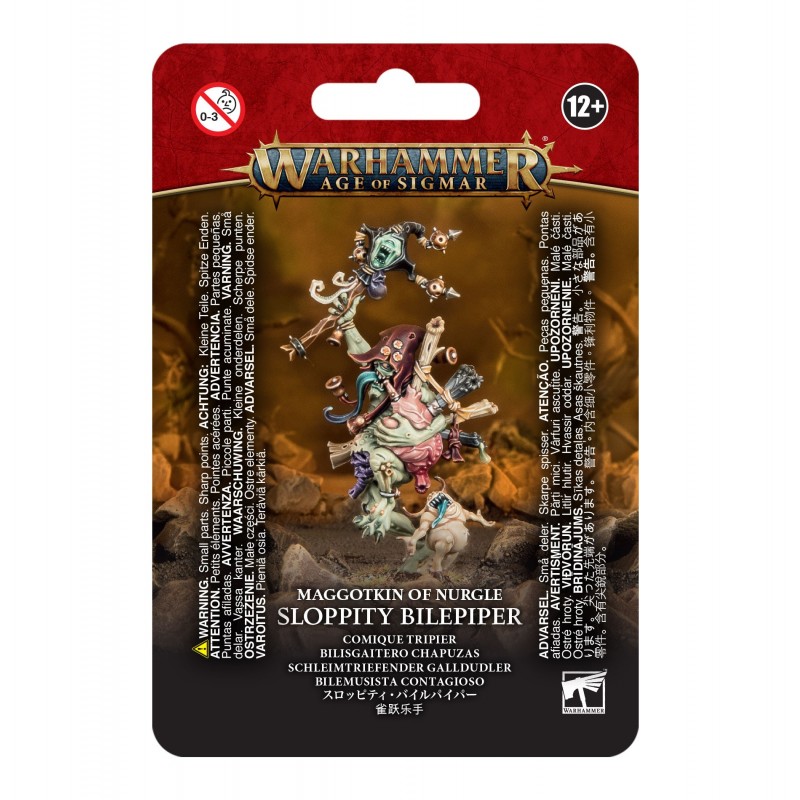 The Sloppity Bilepiper is a strangely cheerful herald of Nurgle's plague-ridden legions. Afflicted by the highly contagious Joyous Encephalopathy, he spreads hysterical laughter across the battlefield – laughter so intense it can rupture the innards of mortals. While his dismal fellow Plaguebearers might not appreciate his antics, the other Daemons of Nurgle find him hilarious. Tragically, the Bilepiper is both entertainer and eventual victim, destined to be turned into a squealing instrument for his successor.