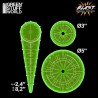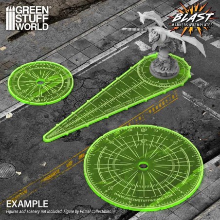 The Green Stuff World explosion template set combines all the essential tools needed to measure area effects in your fantastic battles. Made from 3 mm thick fluorescent acrylic and laser-cut for precision, these templates provide excellent visibility even in low light conditions. The engraved markings are permanent and will never fade, ensuring long-lasting and reliable use during every game.