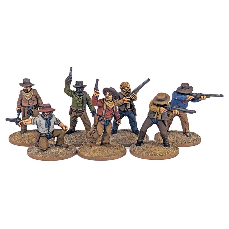 This boxed set contains a complete gang of 7 Cowboys, perfect for your Dead Man’s Hand games. It includes all the miniatures needed to form a cohesive cowboy group, along with a rules booklet, cards, and plastic bases. Each figure is designed with dynamic, realistic poses, capturing the agility, bravery, and iconic style of Wild West cowboys.