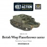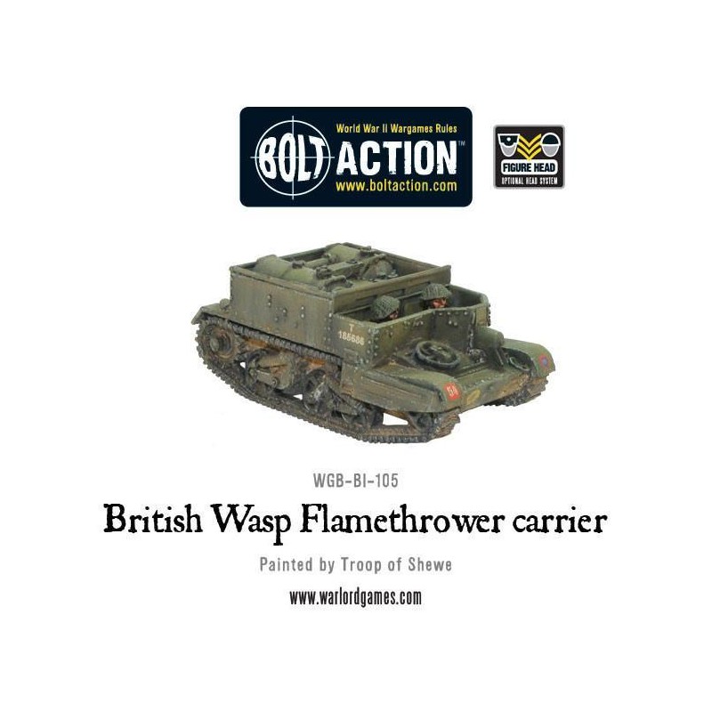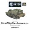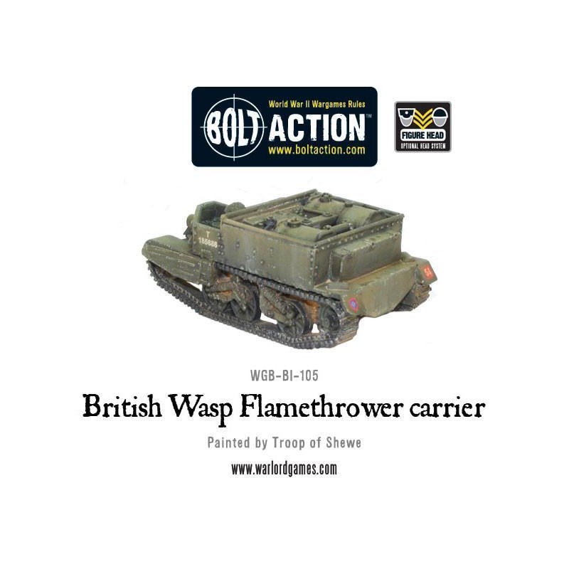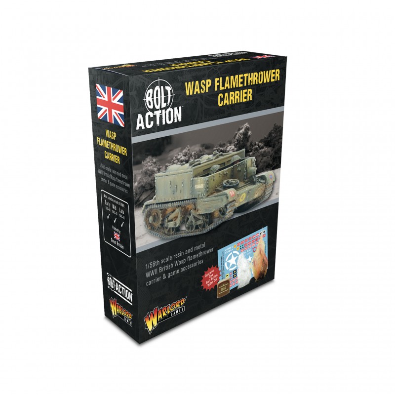 The box contains one Wasp Flamethrower Carrier, two crew figures (driver and flamethrower operator), along with decals, an order die, and damage markers. Compact, deadly, and historically accurate, this vehicle is an essential addition to any British or Allied collection in Bolt Action.