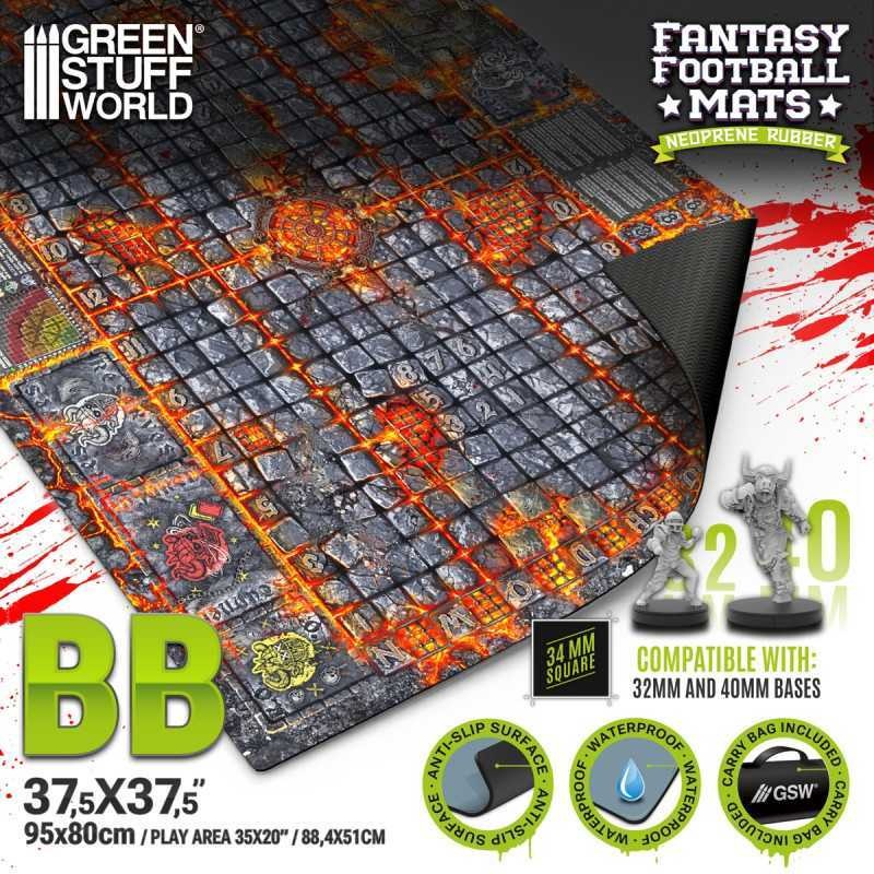 The Green Stuff World Fantasy Football neoprene mats are designed to deliver the best possible playing experience, whether for Blood Bowl or other Fantasy Football games. They feature all the essential elements for smooth gameplay: integrated dugouts, kick-off table, passing chart, and Nuffle tables. With these features, every match runs seamlessly, making them ideal for both casual players and competitive league participants.