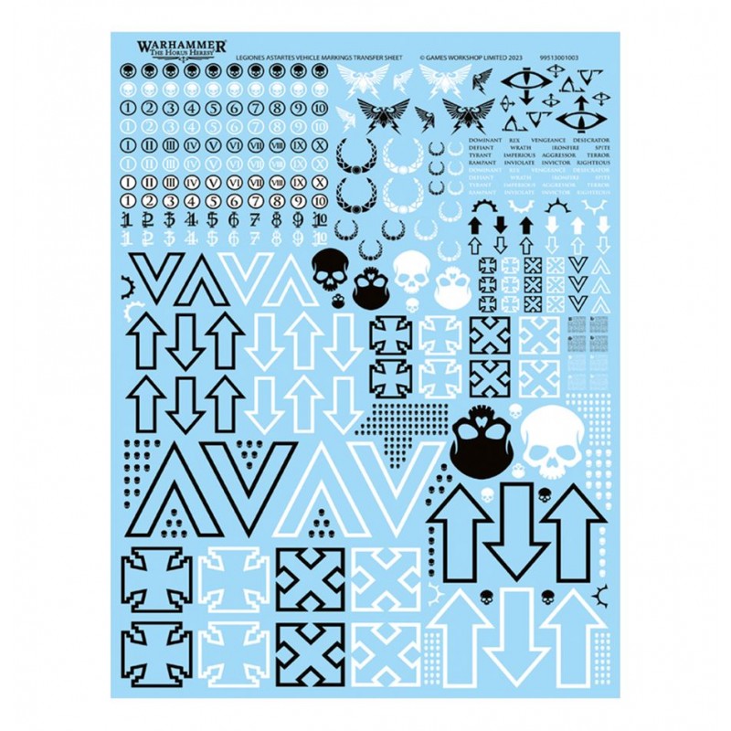 Containing no fewer than 510 high-quality transfers, this sheet provides a wide range of symbols for vehicles, squads, and units. The designs come in various sizes, making them suitable for all types of Legiones Astartes war machines, from transports to towering engines of war. Since the markings are not tied to any specific legion, they can be used for any force, whether Loyalist or Traitor, giving you complete creative freedom.