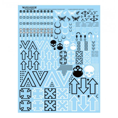 The sheet includes a diverse selection of unit numbers, kill counts, honor badges, and inscriptions. Each transfer adds character, realism, and visual impact to your models, enhancing the narrative of your force. Easy to apply and built to last, these decals are the perfect way to personalize your vehicles and make your army truly stand out on the battlefield.