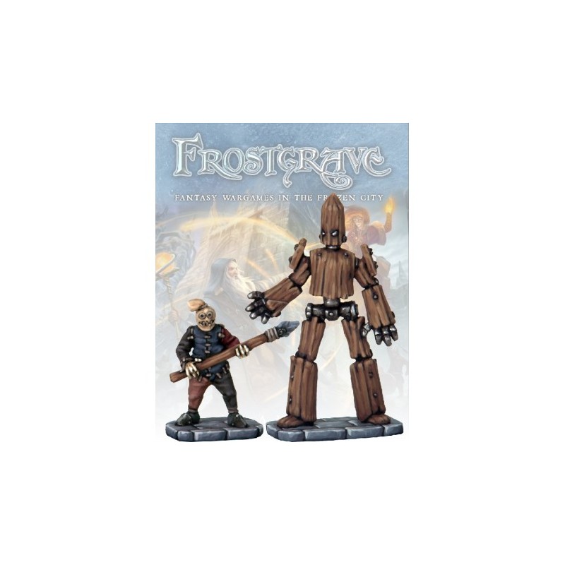 Golems and other constructs can be crafted from nearly any material. Wood, metal, and clay are the most common due to their ease of shaping, but some magicians experiment with stone, bone, plants, or even paper. The box contains two unpainted metal miniatures representing these magical creations, ready to come to life on your Frostgrave gaming table.