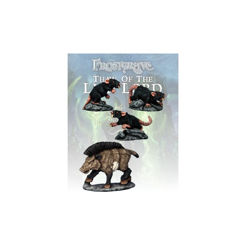 Alongside them, boars are also highly sought after in the frozen North, as they provide a valuable source of food. This box contains four 28 mm pewter miniatures, delivered unpainted. Each figure is finely sculpted to accurately represent giant rats and boars, offering Frostgrave players immersive models to enhance their games and collections.