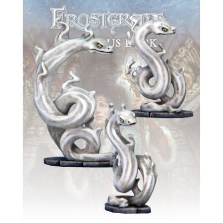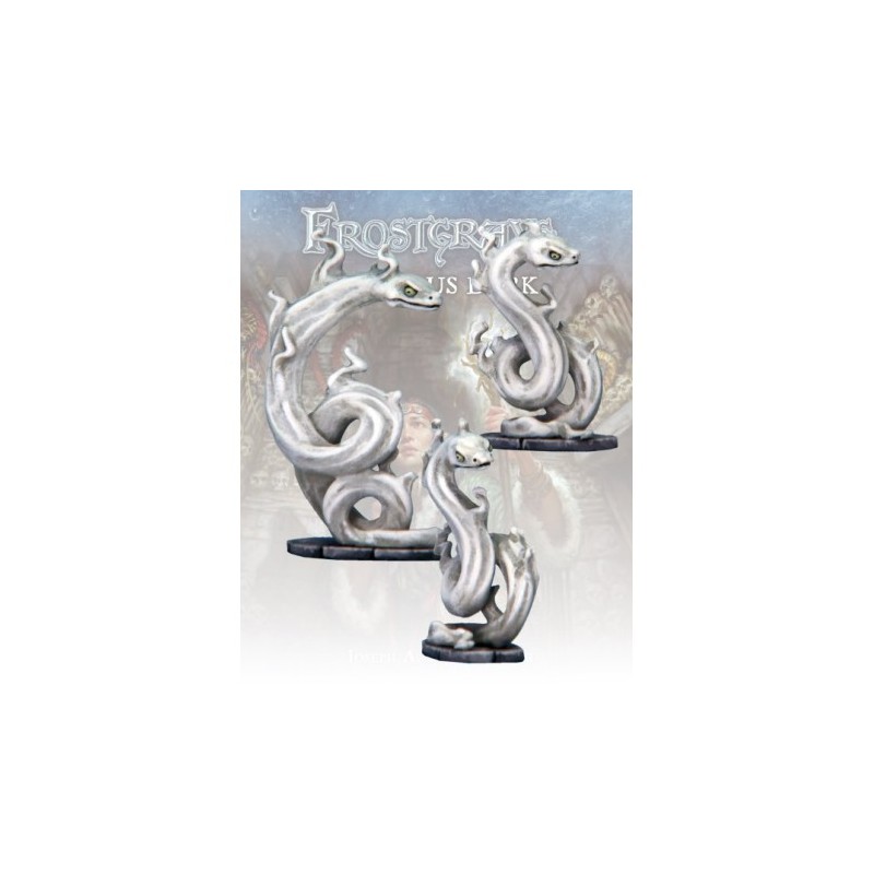 This box contains three pewter miniatures, suitable for 28 mm figures: one large steam serpent and two small steam serpents. The miniatures are delivered unpainted and faithfully capture the fluidity and ethereal form of these creatures. They provide a spectacular addition to your Frostgrave scenarios, introducing visually striking and astonishing enemies to your campaigns and collection.