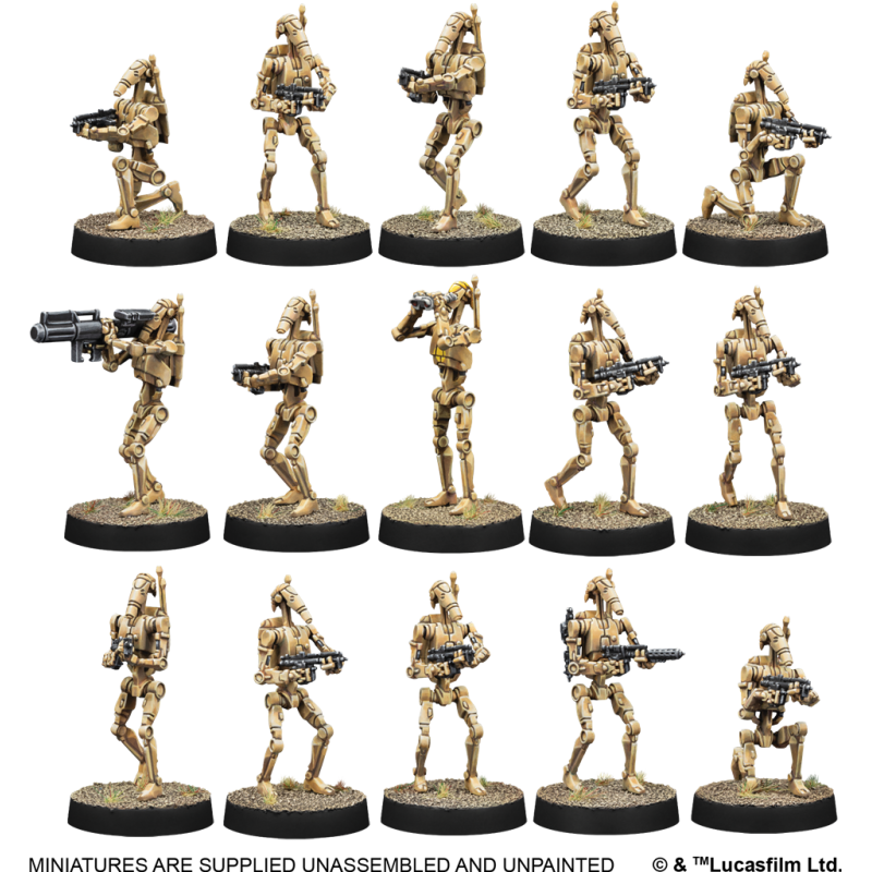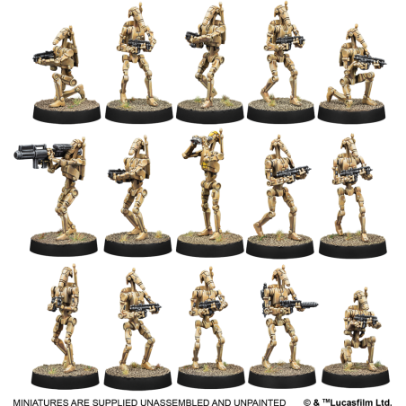 The expansion contains all the cards required for immediate play, including unit, upgrade, and game tokens. The box includes 15 plastic miniatures, 5 cards (1 Unit card and 4 Upgrade cards), 1 token sheet, and 1 reference sheet. Miniatures are supplied unassembled and unpainted. Requires a Star Wars™: Legion Core Set to play. Ideal for players looking to strengthen their Separatist forces with a numerous, adaptable, and screen-accurate army.