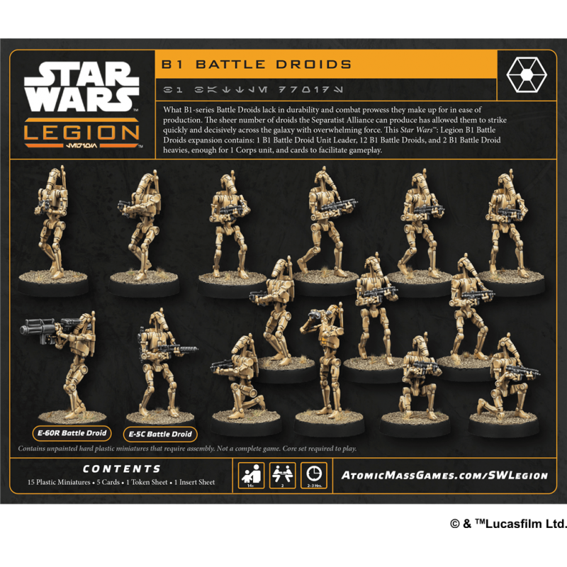 This expansion for Star Wars™: Legion provides everything needed to field a complete B1 Battle Droid unit. It includes 1 Unit Leader, 12 standard B1 Battle Droids, and 2 B1 Battle Droids equipped with heavy weapons, offering strong tactical versatility. For this reissue of pack SWL49, the miniatures feature improved sculpts with greater precision and easier assembly. The refined details and more dynamic poses bring the iconic Clone Wars battles vividly to life on the tabletop.