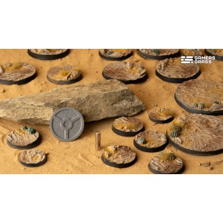 This blister contains 8 thermoplastic 32mm wide round Battle Ready Bases, in a Deserts of Maahl theme.
