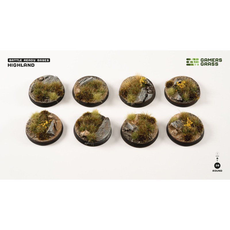 This pack contains 8 round Battle Ready Bases, 28mm wide, in a Highland theme.