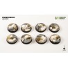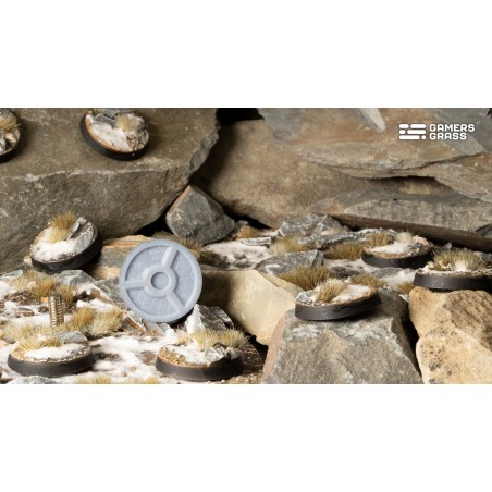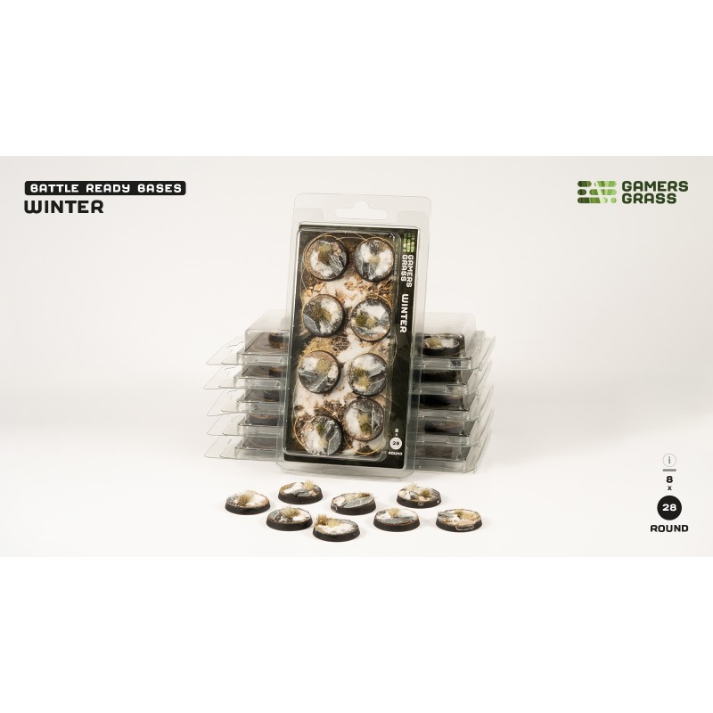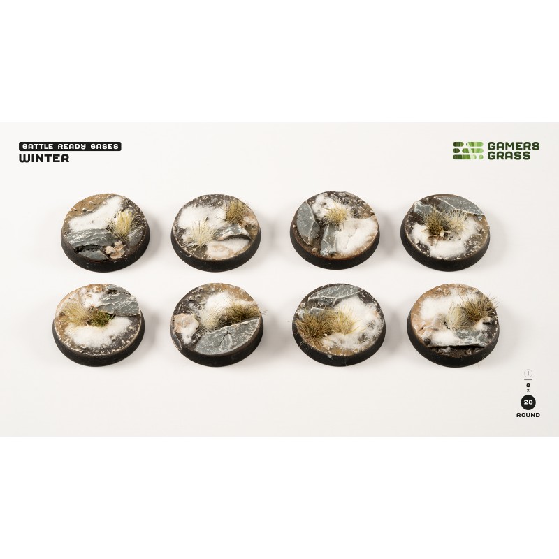 This pack contains 8 round Battle Ready Bases, 28mm wide, in a Winter theme.