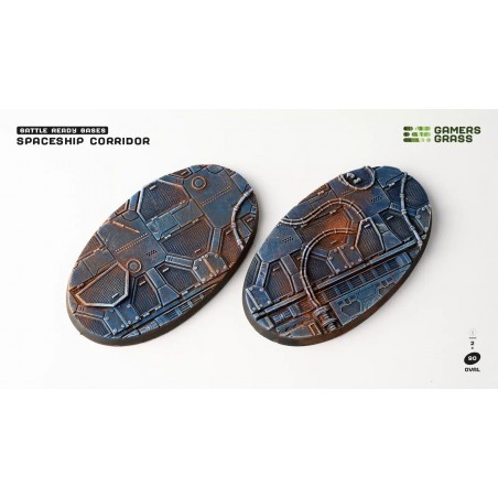 This blister contains 2 oval 90mm Battle Ready Bases in a Spaceship Corridor theme. Made from high-quality thermoplastic, these bases provide a stable and durable foundation, perfect for large miniatures or war machines. The bottom slots are compatible with magnets up to 6mm in diameter and 1mm thick, allowing for easy attachment to display boards or transport systems. Magnets are not included.