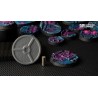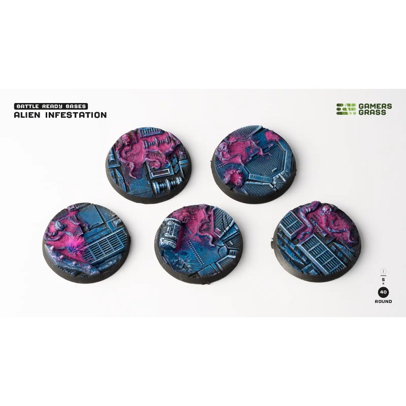 This blister contains 5 round 40mm Battle Ready Bases in an Alien Infestation theme. Made from high-quality thermoplastic, these bases provide a sturdy and durable foundation, ideal for medium to large miniatures. The bottom slots are compatible with magnets up to 6mm in diameter and 1mm thick, allowing secure placement on display boards or transport systems. Magnets are not included.