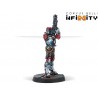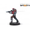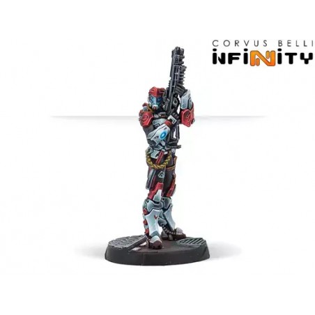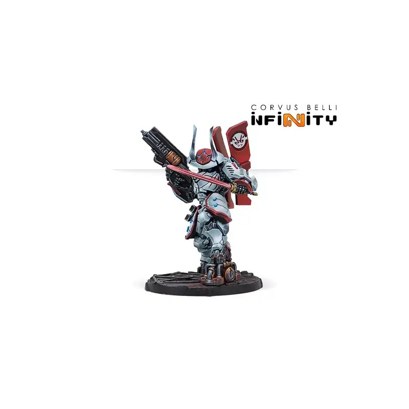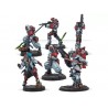 Each member of the Hayabusa unit brings unique skills and equipment to maximize mission effectiveness. The Genbu Paramedic with boarding rifle provides tactical support and medical aid, while the Genbu with Red Fury delivers offensive firepower. The Sohei, equipped with submachine guns and Pulzar, combine mobility with devastating attacks, and the Kyosho Hacker with combi rifle manages electronic control and system neutralization. The Daiyokai with HMG completes the team, providing sustained fire to repel enemy advances.