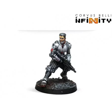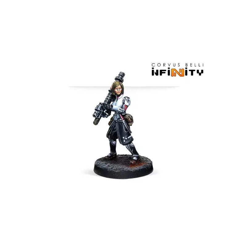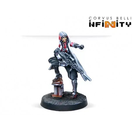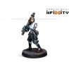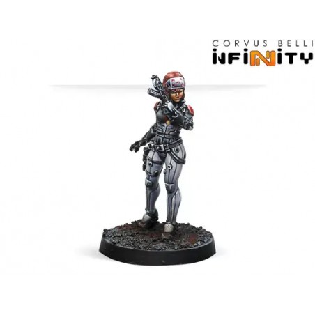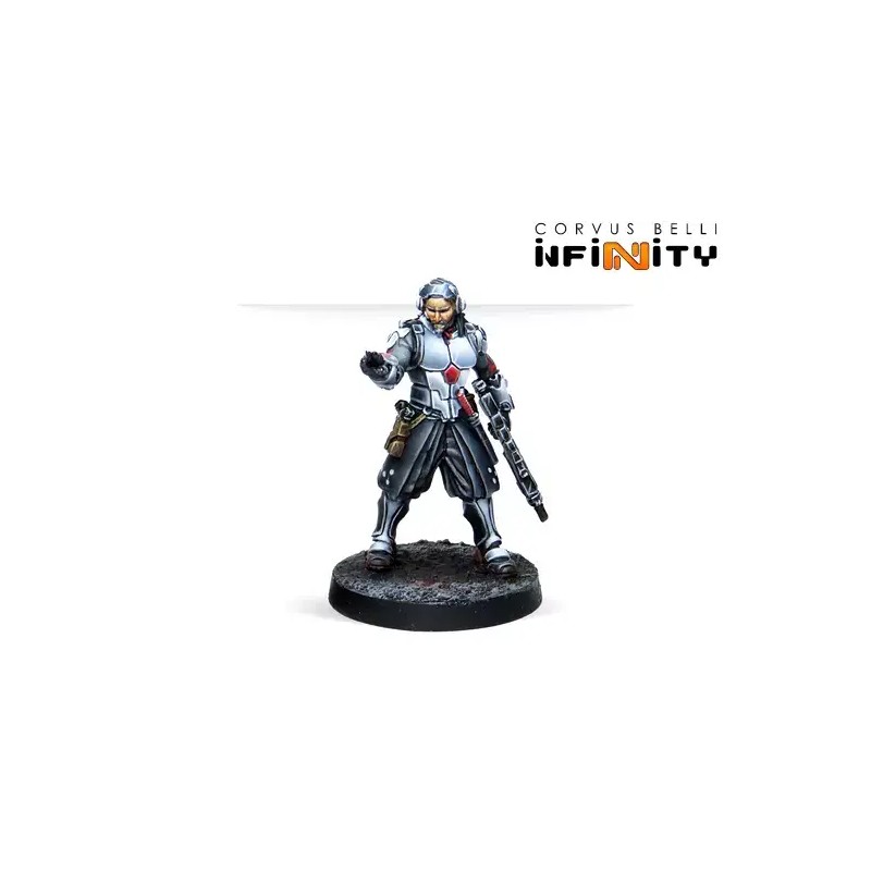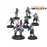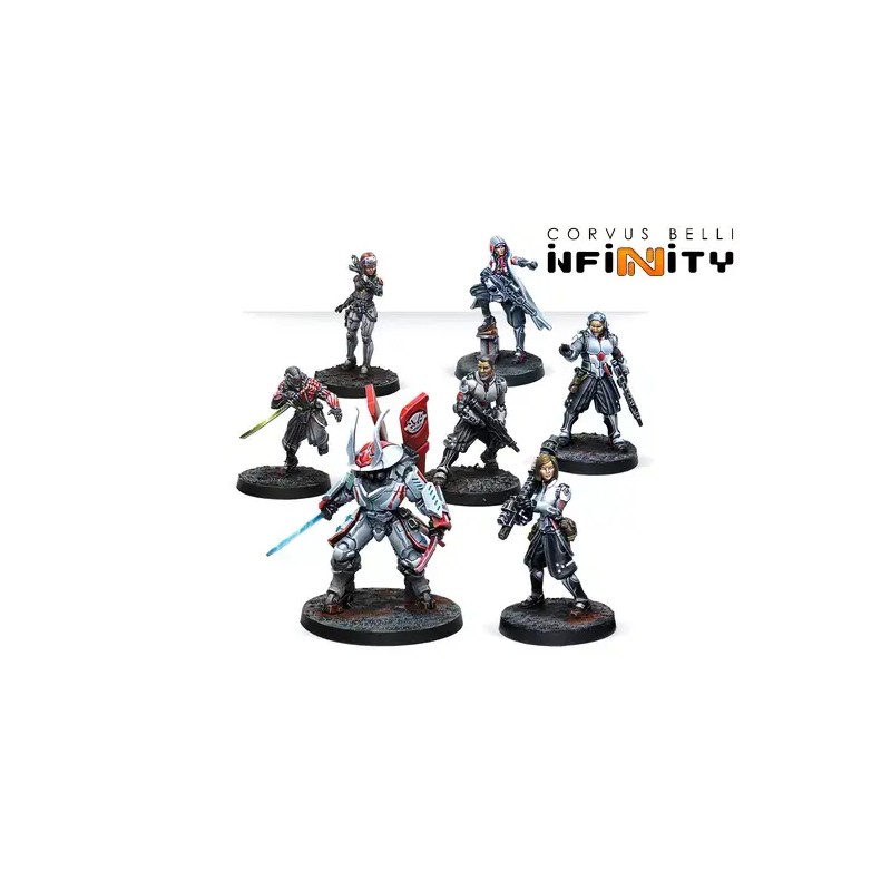 This box includes seven metal miniatures, supplied unpainted and unassembled, along with stat cards for each figure and a weapon reference card. It is an excellent starter set to begin playing and collecting JSA, offering a complete and balanced group to explore tactics and strategies in the Infinity universe.