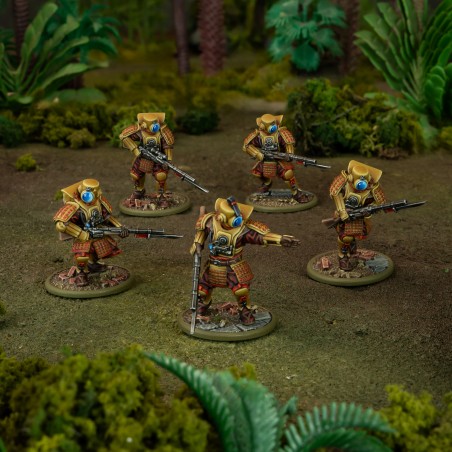 On the tabletop, Ghost Attack Squads offer a unique and exciting strategic element. Their combination of stealth, firepower, and maneuverability creates new tactical opportunities to surprise and dominate opponents. This set contains five Warlord Resin models armed with Type 10 Shiboru Rifles, finely detailed to accurately represent these elite troops. They provide a visually striking and tactically potent addition to any Japanese force, enhancing both battlefield diversity and visual impact.